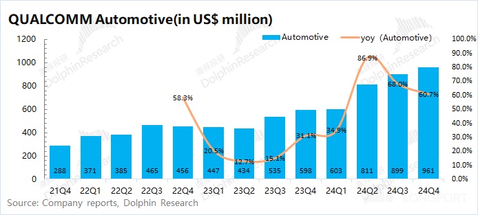 高通的汽车业务在 2025 财年第一季度(即 24Q4)实现营收 9.61 亿美元,同比增长 60.7%,好于市场预期(9.02 亿美元)。汽车业务是公司主要业务中增速最快的一项,已经连续第六个季度创新高。随着汽车制造商采用公司的高性能、低功耗计算和连接芯片,为消费者带来下一代体验,新推出车辆中的相关产品内容持续增加,推动了这一增长。