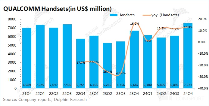 高通的手机业务在 2025 财年第一季度(即 24Q4)实现营收 75.74 亿美元,同比增长 13.3%,好于市场预期(70 亿美元)。本季度的增长,主要来自于新推出的骁龙 8 Elite 平台行业领先性能的推动,安卓高端机型的销量和产品附加值均有所提升。