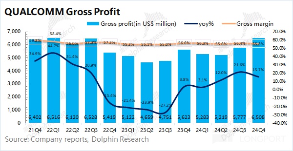 高通在 2025 财年第一季度(即 24Q4)实现毛利 65.08 亿美元,同比增长 15.7%。