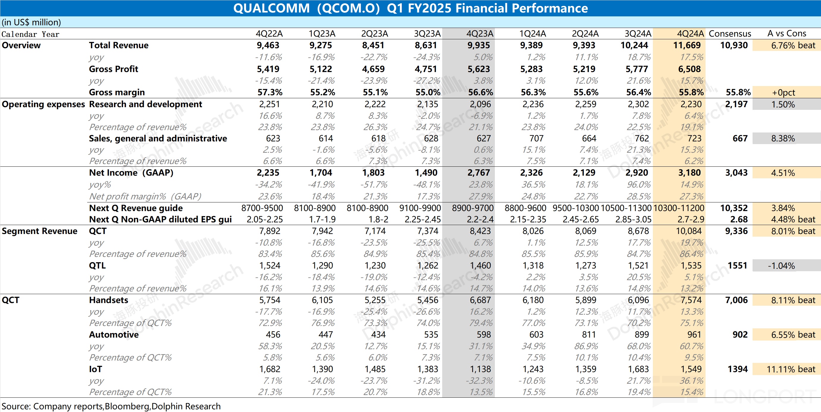 1、整体业绩:收入&利润,继续增长。高通在 2025 财年第一季度(即 24Q4)实现营收 116.7 亿美元,同比增长 17.5%,好于市场预期(109.3 亿美元)。公司本季收入增速继续增长,主要受益于 QCT 业务中的手机、汽车及 IoT 等业务全面回暖;$高通(QCOM.US) 在本季度实现净利润 31.8 亿美元,同比增长 14.9%,好于市场预期(30.4 亿美元),增长主要来自于业务回暖的推动。