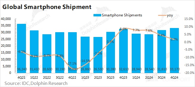 从行业数据看,2024 年第四季度全球智能手机出货量为 3.32 亿台,同比增长 1.7%。虽然手机市场出货量的整体增速相对有所回落,但公司的主要客户在本季度表现还是不错的。