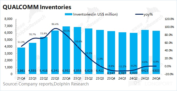 高通在 2025 财年第一季度(即 24Q4)的存货有 63.03 亿美元,同比略增 0.9%。结合过往数据看,海豚君认为公司的存货端已经改善。近两个季度的小幅回升,主要是公司对新品备货的增加,整体经营面仍然向好。