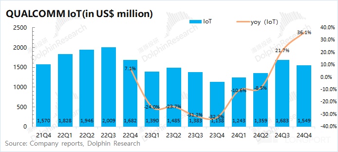 高通的 IoT 业务在 2025 财年第一季度(即 24Q4)实现营收 15.49 亿美元,同比增长 36.1%,好于市场预期(13.94 亿美元)。在经历低谷后,公司的 IoT 业务迎来连续增长。