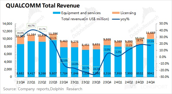 受益于 2025 年 1 月开始的中国补贴政策,高通对下季度预期的营收和 non-GAAP 每股收益也都不错,两项都达到了市场预期。虽然营收和每股收益环比有所回落,但这主要是受季节性因素影响。
