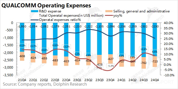 高通在 2025 财年第一季度(即 24Q4)的经营费用为 29.53 亿美元,同比增长 8.4%。由于收入增速更快,公司本季度经营费用率继续下滑至 25.3%。