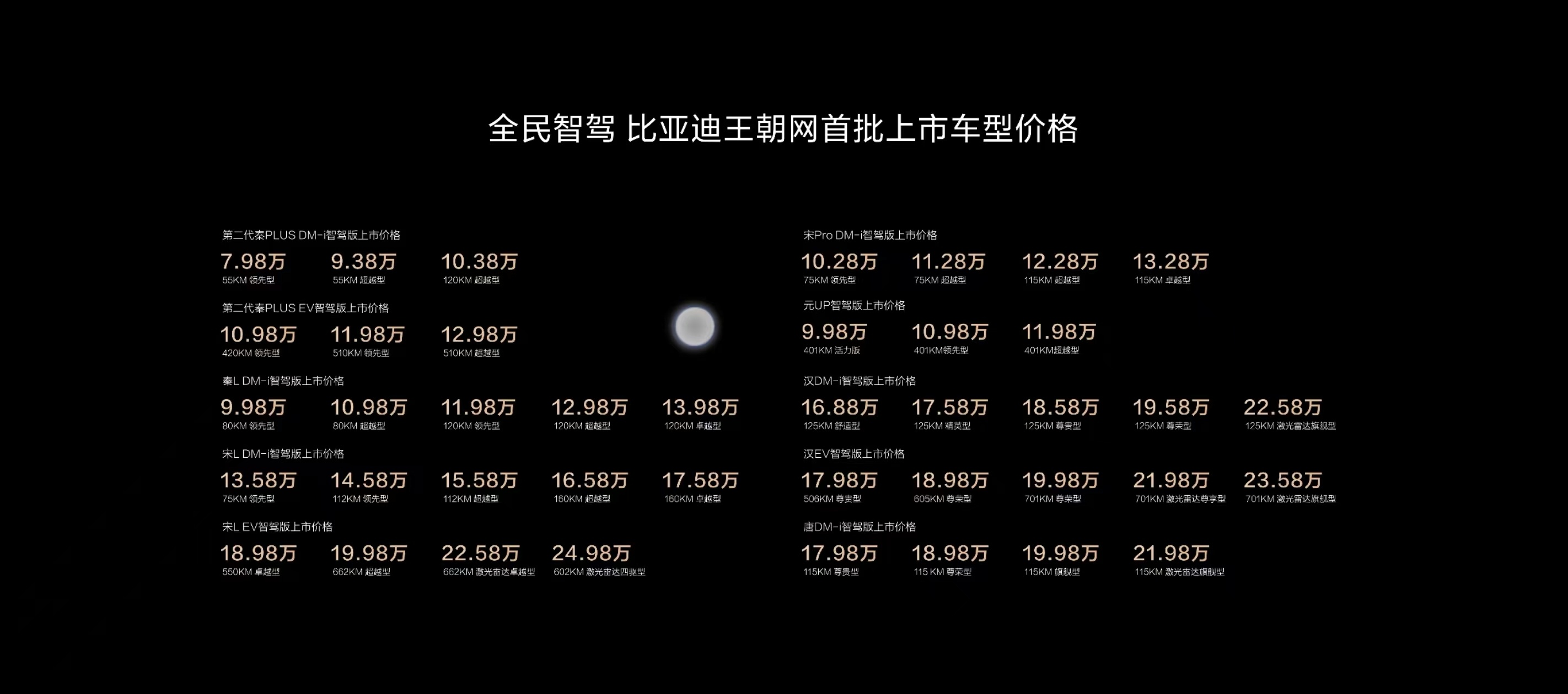 发布会上公布了各车型智驾版的价格,涵盖王朝网和海洋网众多车型,如唐 DMI 智驾版、汉 EV 智驾版、汉 DMI 智驾版、海狮 07EV 智驾版、海豹 07 DMI 智驾版、宋 PLUS DMI 智驾版、宋 L DMI 智驾版、宋 PLUSEV 智驾版、秦 L DMI 智驾版、海豹 06 DMI 智驾版、海豚智驾版、元 UP 智驾版、海鸥智驾版等,并且均做到加配不加价,让消费者能够以实惠的价格享受到智驾带来的便利和安全。
