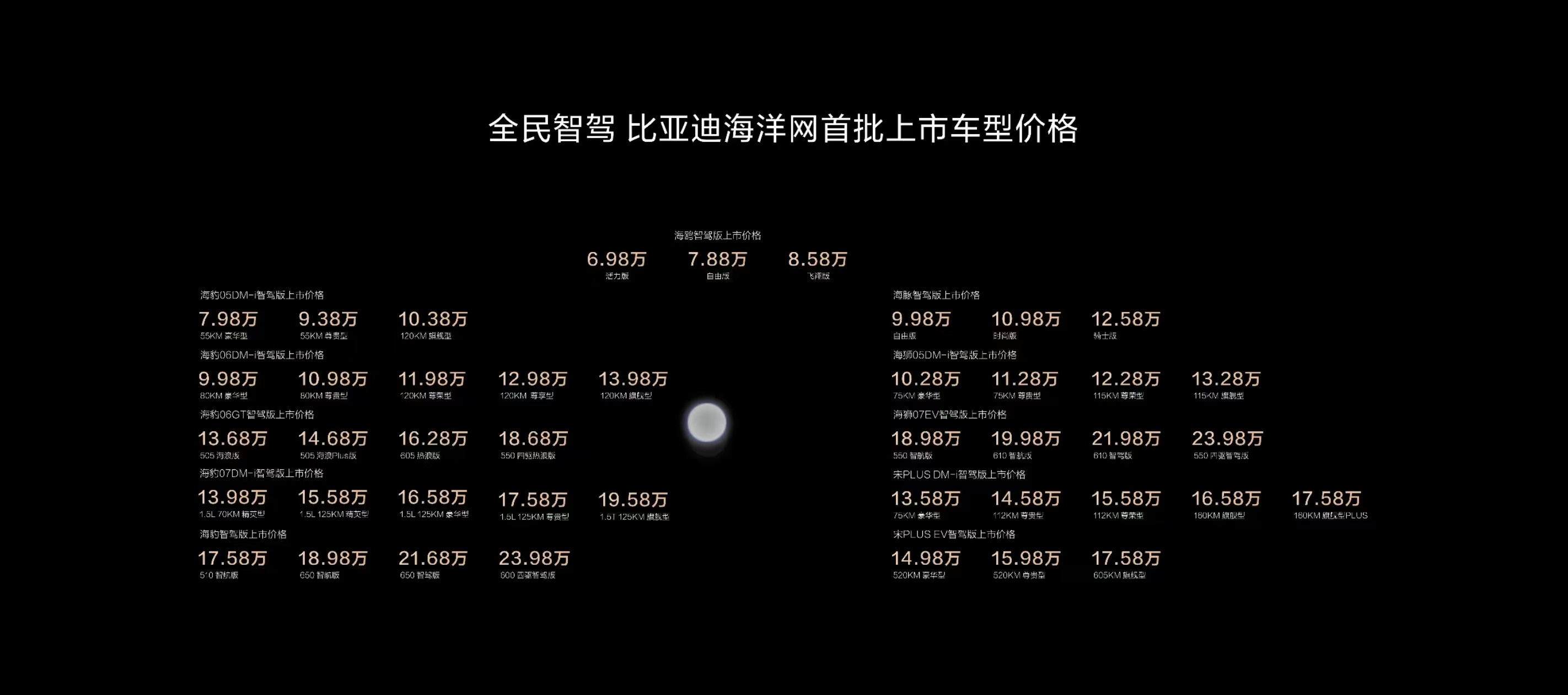 海洋网:海豹 07EV、海豚智驾版、海鸥智驾版(7 万级)主打年轻化与科技感。