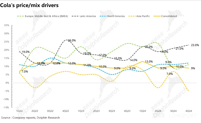 量:从浓缩液销量上看,除了北美地区略低于预期外,其余地区均超预期。结合管理层电话会上的发言,海豚君推测主要系可口可乐针对消费力下降的地区及时调整了产品线,推出了价格更加实惠的包装。以中国为例,可口可乐在下半年明显提升了 MINI 罐装的比例,MINI 罐装单瓶售价仅为 1.7 元,低于经典装,对于 “消费降级” 的消费者来说接受度显然更高。此外,管理层也强调 Q4 在发展中国家和新兴市场大范围推广可回收玻璃瓶包装,售价低于普通包装,吸引了大批价格敏感型消费者。