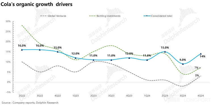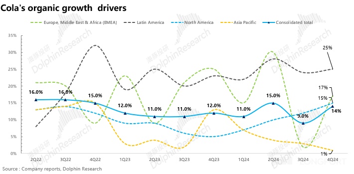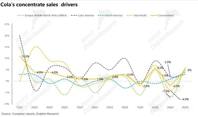 海豚君下文重点关注可口可乐的内生收入增长情况,并拆解成浓缩液销量和价格组合两部分驱动因子进行分析: