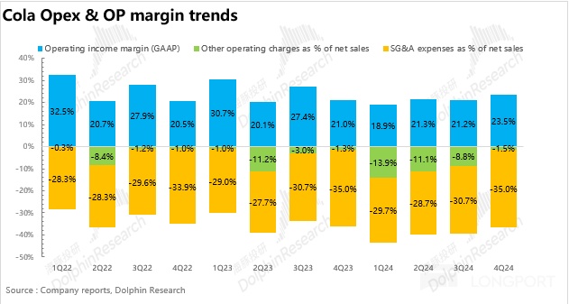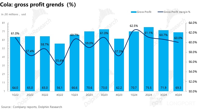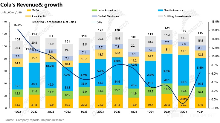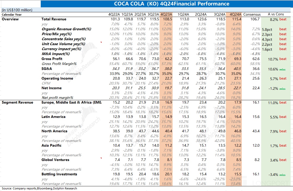 24Q4 可口可乐实现表观营收 115.4 亿美元,同比增长 6.4%,超出市场预期(市场一致预期 106.7 亿美元)。