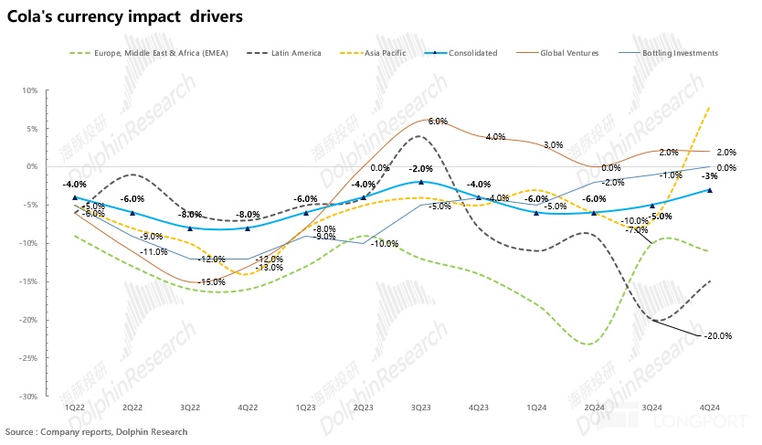 1、量价齐升,内生增长依然亮眼:4Q24 可口可乐实现表观营收 115.4 亿美元,同比增长 6.4%,超出市场预期 8%(市场一致预期 106.7 亿美元),其中内生营收(Organic revenue)同比高增 14%,量价拆分看,浓缩液销量增速和价格增速分别同比增加 5%/9%;双双超出市场预期。此外,虽然 Q4 美元指数依然持续走强,但公司通过一系列对冲手段使得外汇逆风影响下降至 3pct,有所放缓。