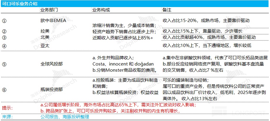 (1)其中欧洲、中东&非洲(EMEA)、拉丁美洲、北美、亚太四个部门按照地理区域划分,大部分收入来自销售给特许瓶装商的浓缩液,少数也来自部分成品饮料的销售。