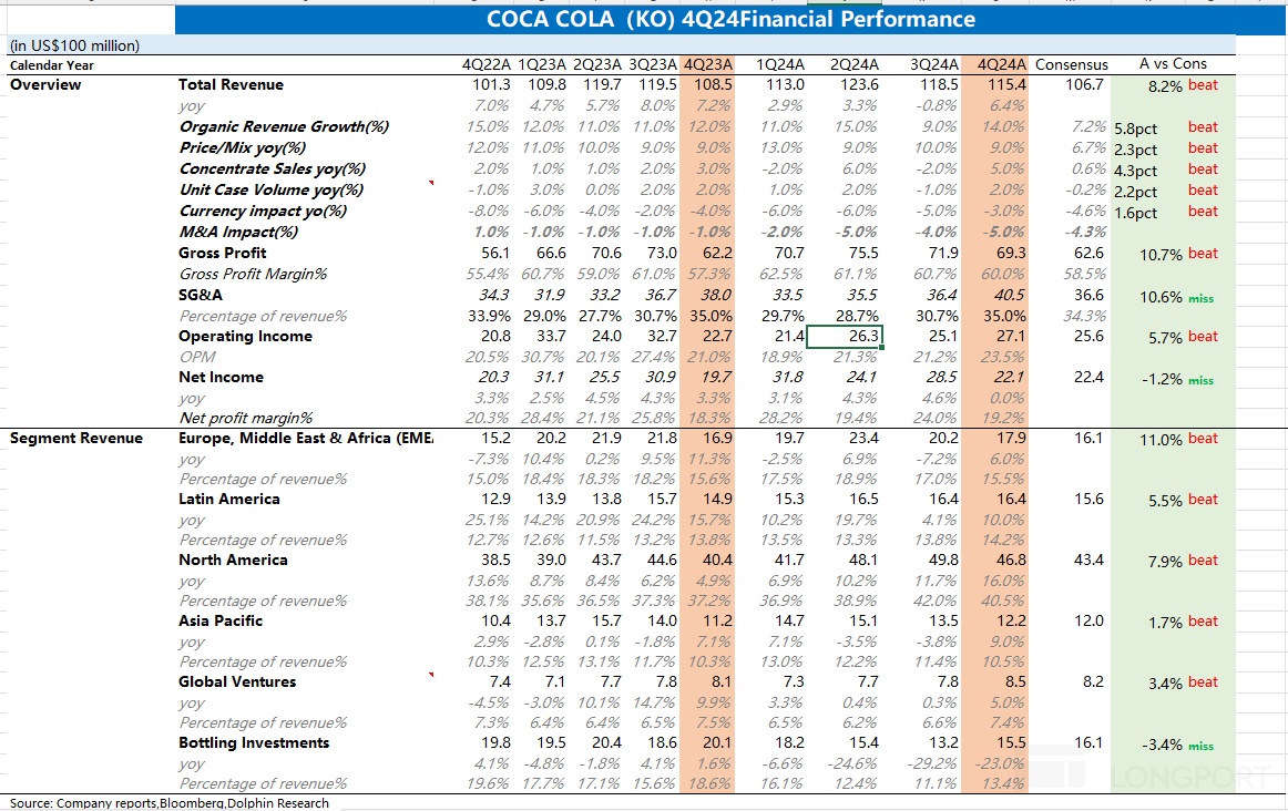 1. 内生增长量价拆分:24Q4 有机收入 (内生) 增长 14%,其中浓缩液销量增长 5%,价格组合增长为 9%(8 个点为通胀性定价;1 个点为优化产品组合)。