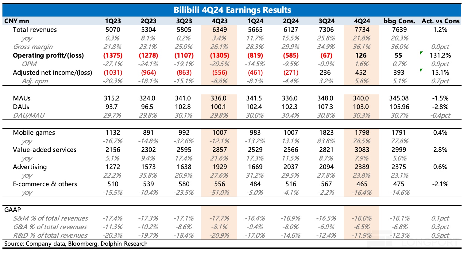 整体看,小破站$哔哩哔哩(BILI.US) $哔哩哔哩-W(09626.HK) 四季度业绩基本符合预期,在游戏和广告的高增长下,GAAP 下的盈利首次转正。