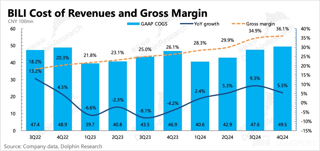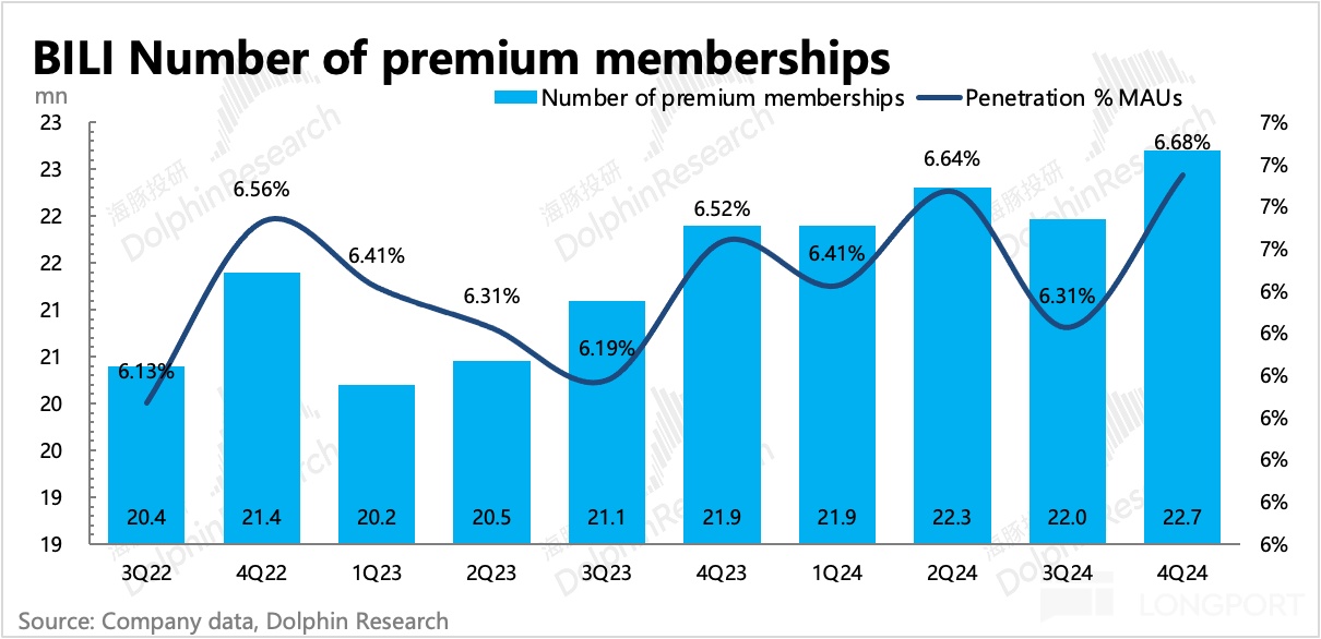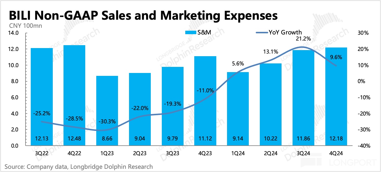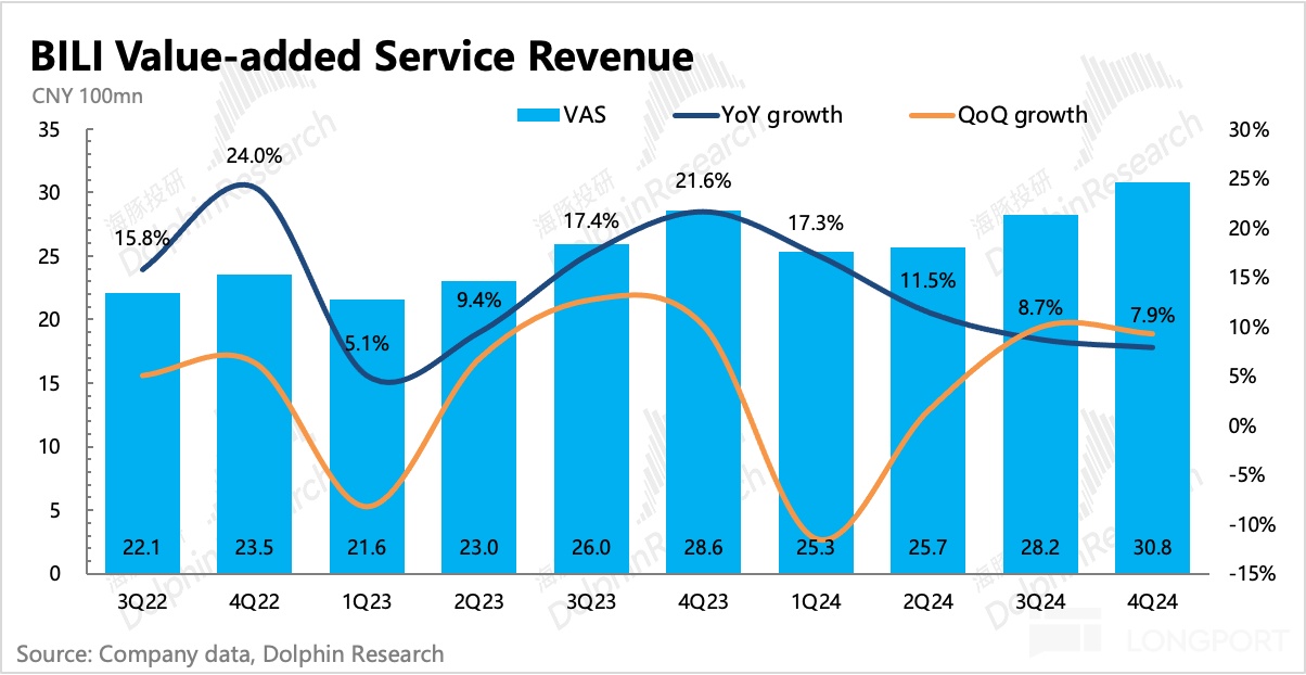 直播 + 大会员订阅为主的 VAS 增值服务收入,四季度同比增长 7.9%,环比看继续放缓,但放缓速度也慢了。