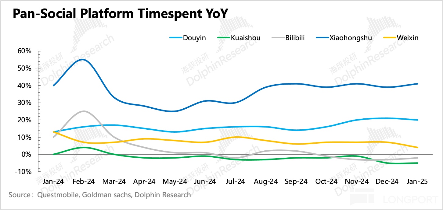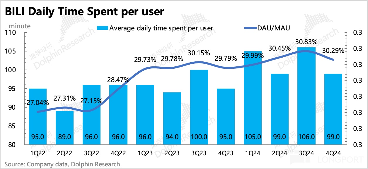 2. 流量继续缓慢增长,天花板可见:四季度月活增速继续放缓,略低于预期。DAU/MAU 粘性保持在 30%,四季度日均用户时长 99 分钟。