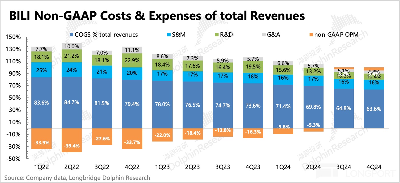 1. GAAP 下首次盈利:之前说 B 站盈利,都是在剔除股权激励费用后的 Non-GAAP 情况下的盈利。但四季度 GAAP 下经营利润实现了 1.26 亿,利润率 1.6%,处于刚刚转正的位置。因此再加回约 4pct 的 SBC 费用,经调整净利润 4.5 亿,利润率 5.8%,相比三季度进一步盈利改善。