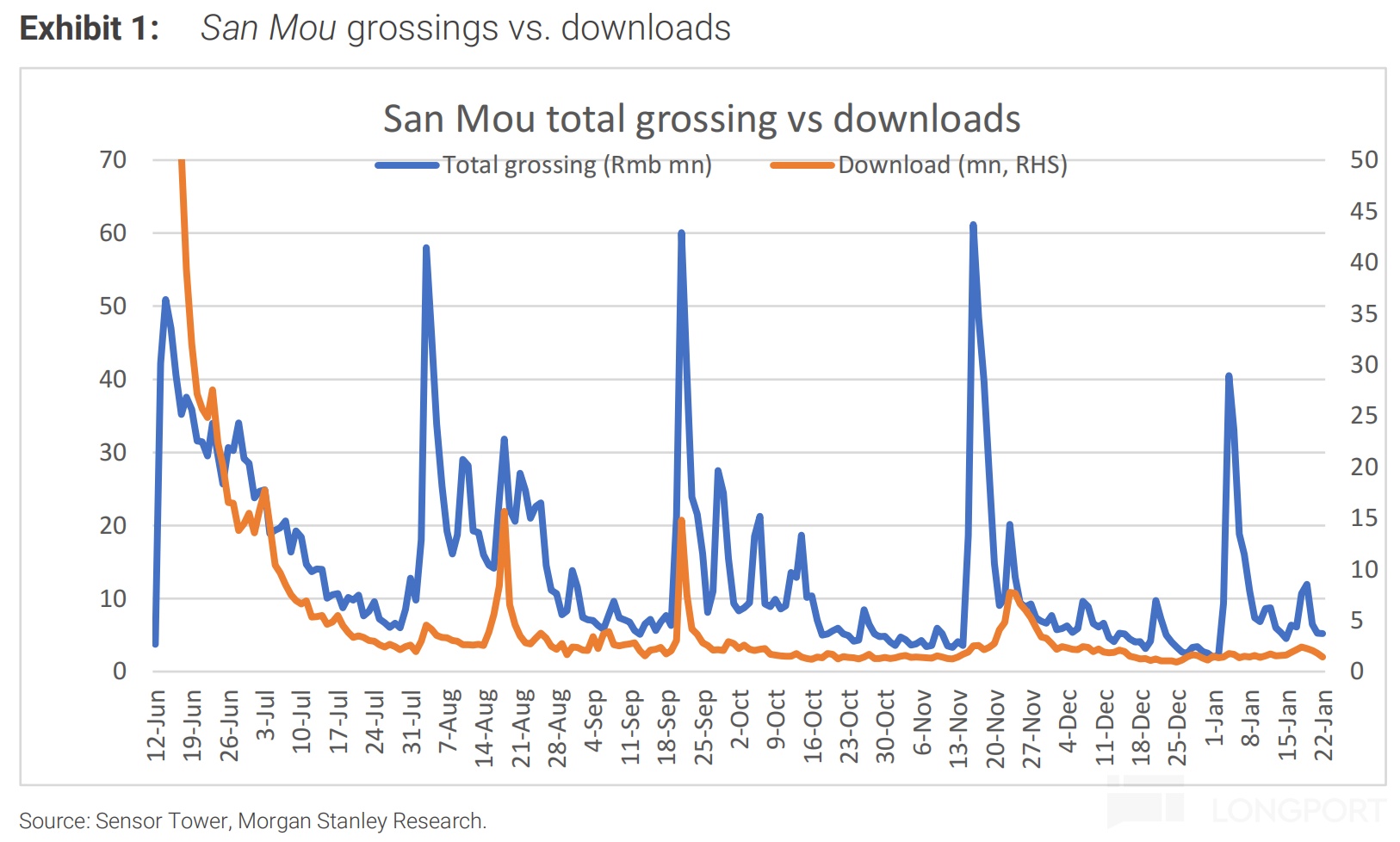 虽然四季度 B 站还面向全球地区(日本之外)发了一款新游戏《咒术回战》,不过整体反响一般,月流水预计在 1-2 亿人民币,而对比《三谋》在 Q4 的流水规模估计有 8 亿。