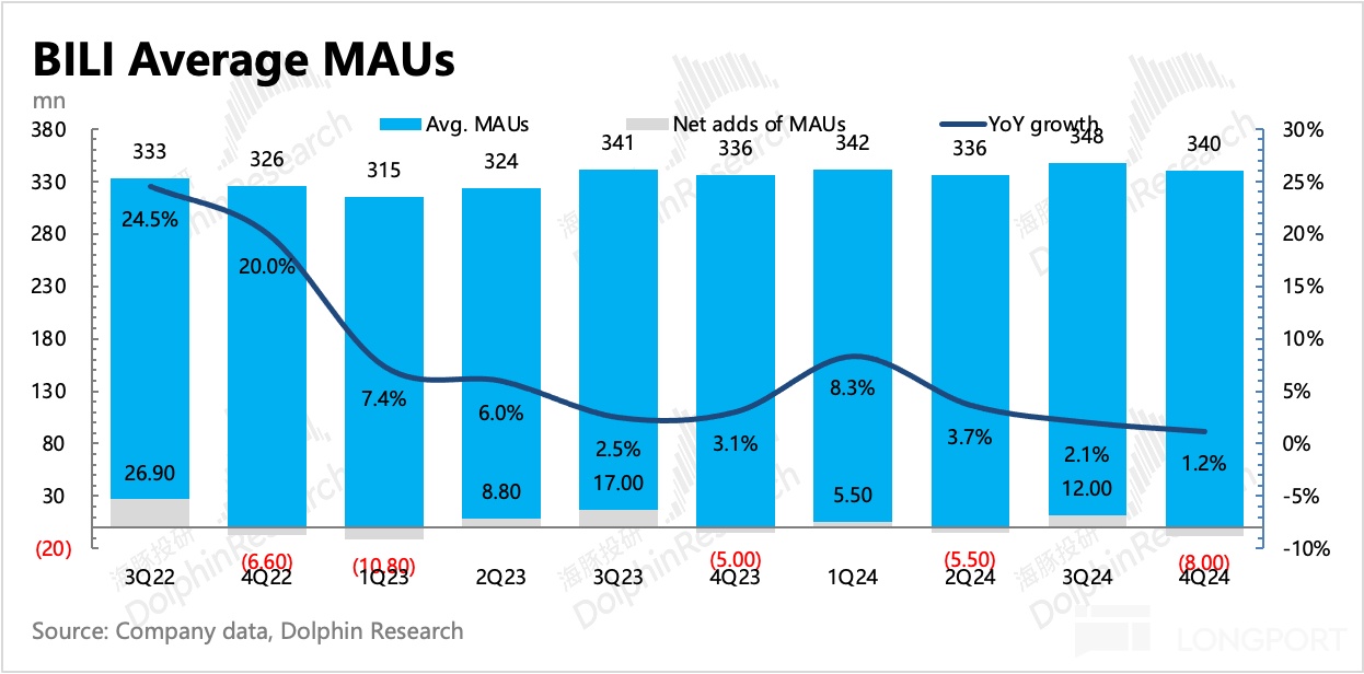 1. 四季度 B 站整体月活(App、PC、电视等)3.4 亿人,同比增长 1.2%,淡季环比下滑 80 万人。