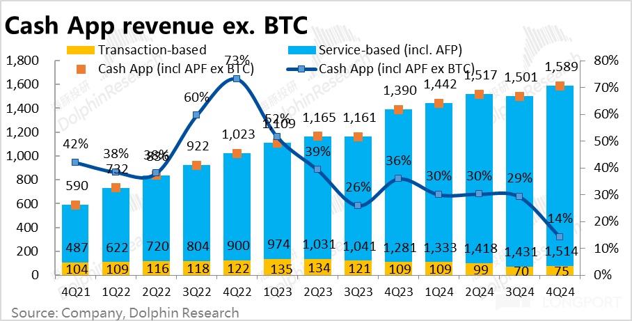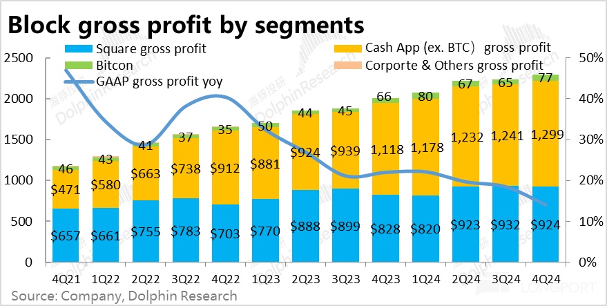 本季剔除比特币业务后,Cash App 板块实现营收 15.9 亿美元,同样由于一年前 BNPL 业务 100% 计入 Cash App 板块的利好过去后,本季同比增速环比跳水式下降到 14%,但市场对此预期充分。细分来看: