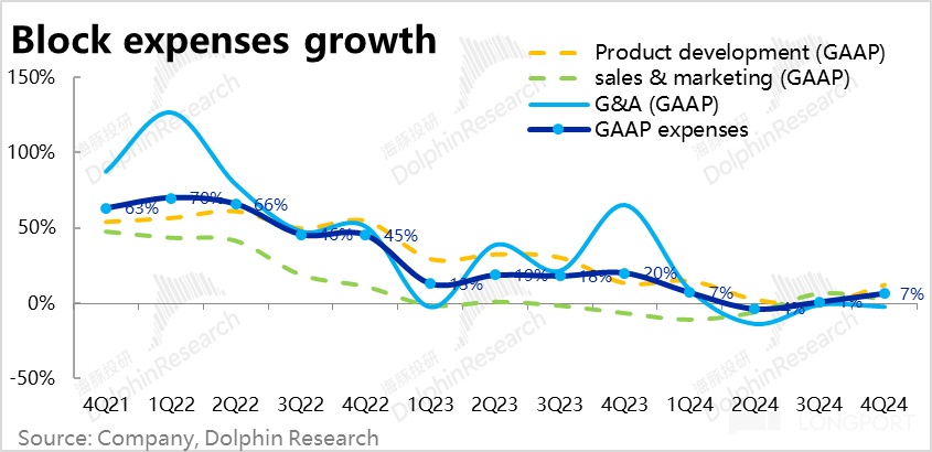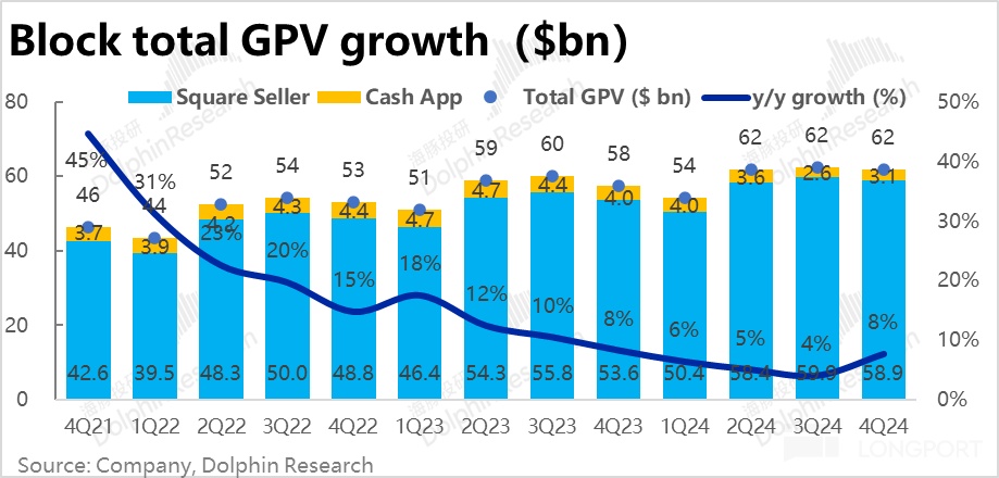 Square 生态内的 GPV 同比增速也由 7.3% 修复到了 9.9%。但业绩前市场对 Square 增长再加速的预期相当高,实际修复幅度并不算高。