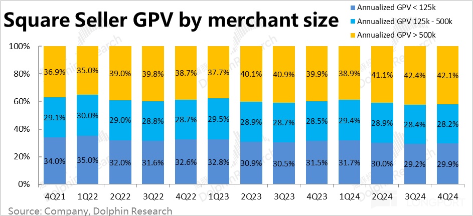 按商家规模分类的占比变化上,本季度年支付额 > 500k 以上的大型商户比重环比有所下滑 0.3pct,不过从历史看 4Q 大型商户比重环比下降似乎是普遍情况。大/中/小型商家各种贡献的 GPV 同比增速分别为 16%/8%/4%,可见大型商家仍是驱动总支付额增长的主要动力。