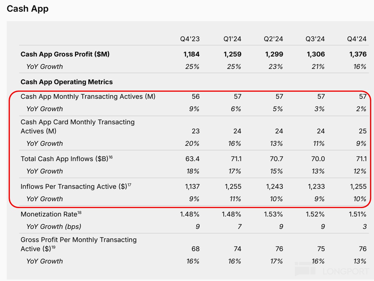 关键指标 — Block 生态内商家完成的 C2B 支付金额 (包括 Cash App 渠道) 约$619.5 亿,同预期大体相同。同比增速从上季 4% 的地步反弹到了约 8%。其中通过 Cash App 渠道完成的 C2B 支付额约 31 亿美元,强于预期的 29 亿,是整体增速改善的主要原因。但同比来看依旧下滑了 23%