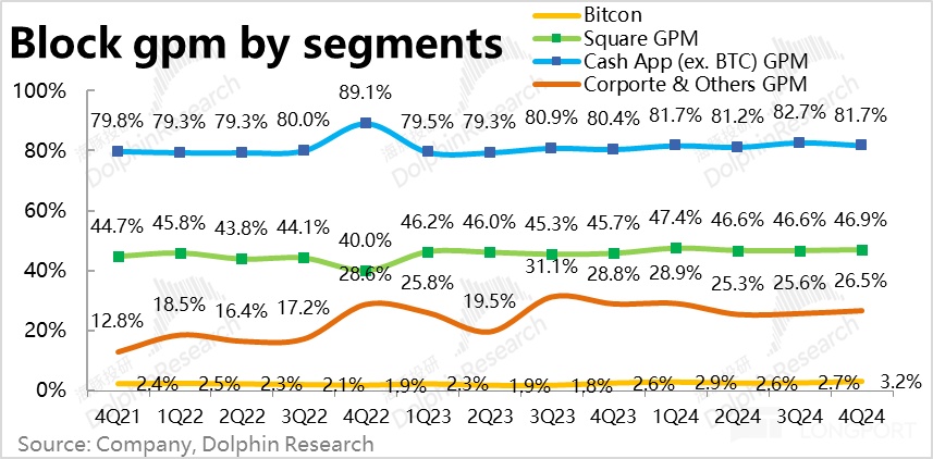 2、剔除比特币业务后,Cash App 板块实现毛利润 13 亿美元,同比增长了 16%,同样略低于市场预期的 13.2 亿。毛利率也环比下降了约 1pct 到 81.7%,低于预期的 82.9%,Cash App 板块的盈利能力也有预期外的下降。