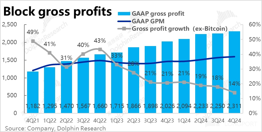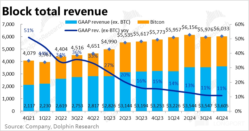 加总各项业务,本季 Block 总营收60.3 亿美元,同比增长了 4.5%,显著低于预期约 9% 的增速,如前文所述主要是 Bitcoin 业务收入并未如预期的显著增长,反而同比下滑的拖累。剔除波动较大的比特币业务后,核心收入为 36 亿,同比增长 11%,就只是略低于市场预期的 36.6 亿了。