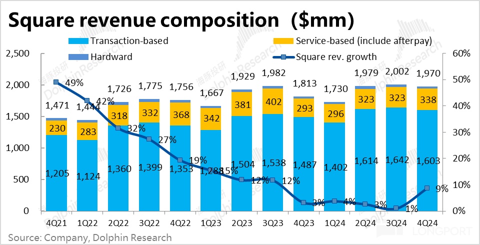 公司的基石业务 — Square 板块本季营收约 19.7 亿美元,同比增长 9%,环比明显提速。不过正如 4Q23 时增速跳水主要是 BNPL 业务不在计入 Square 的影响,此次增速调增也主要是由于影响基数期的过去。相比市场预期约 11.5% 的营收增速,实际表现是跑输的,分细分业务具体来看: