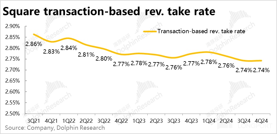 此外,Square 生态内实现的 GPV 本季同比增速也由 7.3% 修复到了 9.9%。由此可见,底层指标 GPV 的修复程度是比收入口径更好的。体现到财务指标上,本季 Square 板块支付业务的综合手续费率是同比下降了 3bps。