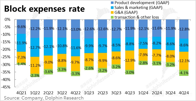 3)单项营收贡献最大的 Bitcoin 业务,本季营收为 24.3 亿,同比负增 4%。原本伴随着 Trump 当选带来的加密货币暴涨,市场认为股市的 Bitcoin 会明显受益,预期的是 +4% 的增长。换言之,Bitcoin 业务显著 miss 了市场的预期。