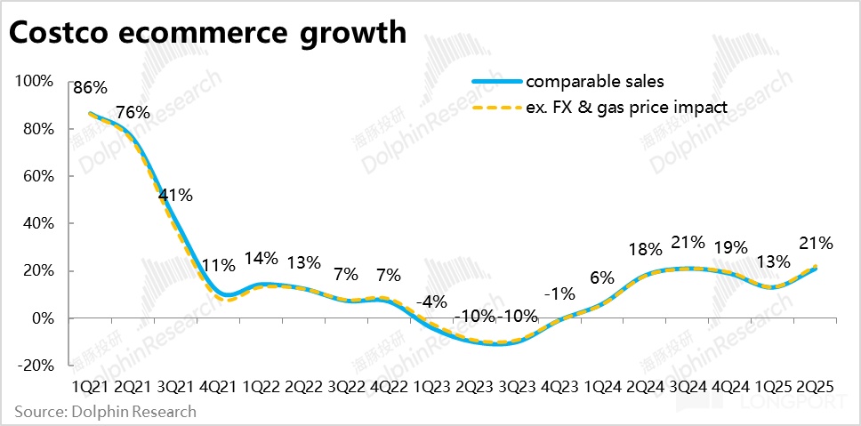 作为后疫情时代的增长新动力,Costco 本季电商销售额同比增长高达 21%,较上季大幅提升,显著高于预期的 15%。据披露,Costco线上站点流量同比增长 13%,客单价同比增长了 10%。同样展现出明显的价格上升倾向,不过应当不只是通胀因素,品类上表现最强的黄金、珠宝首饰的比重上升应当也有贡献。