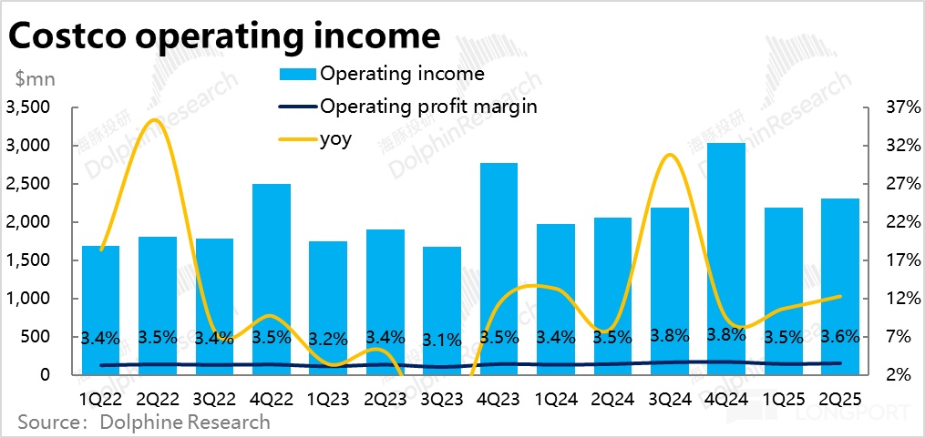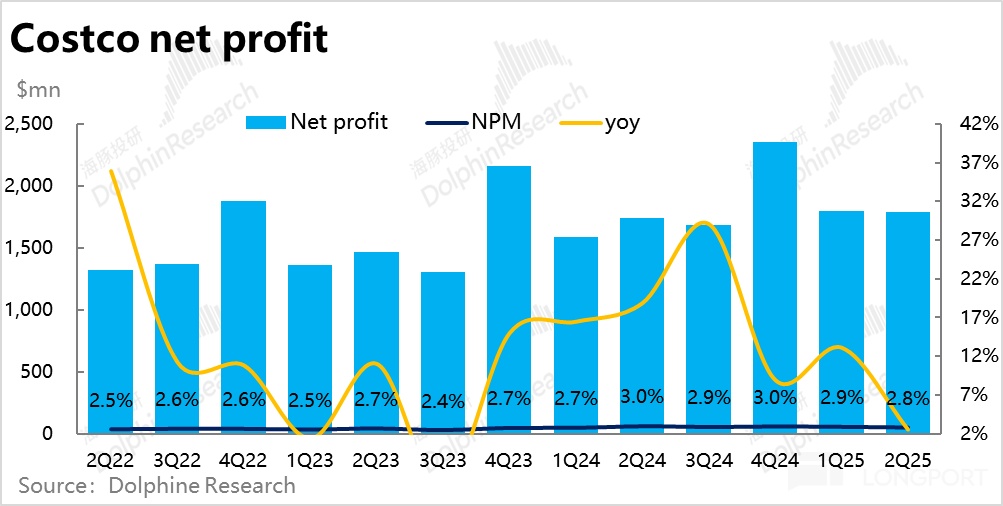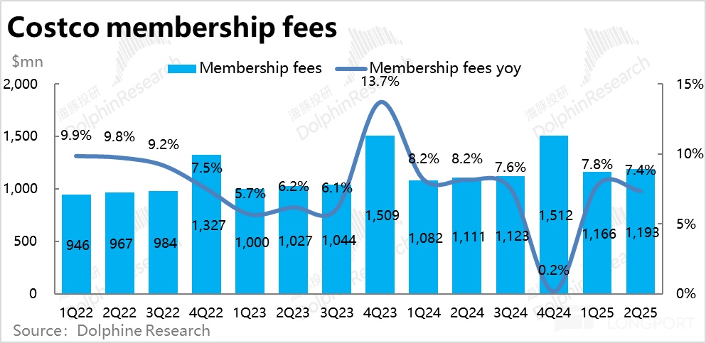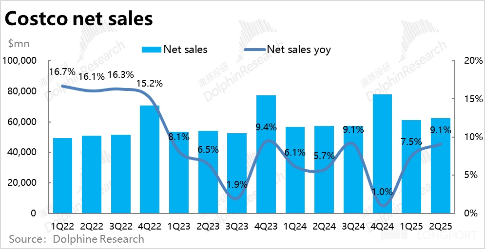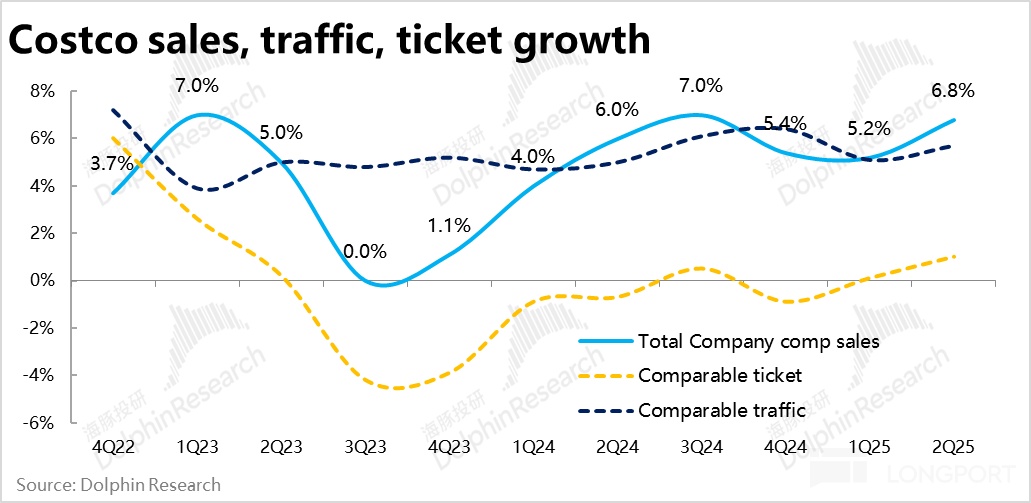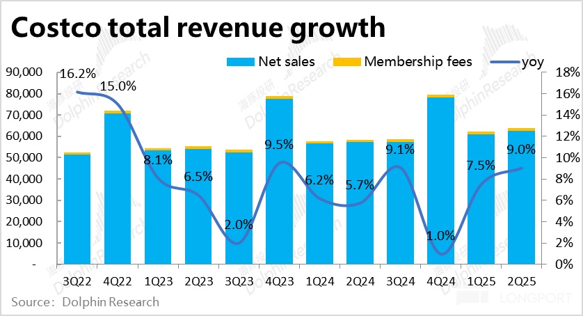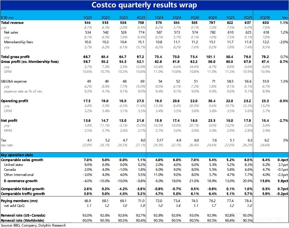 财务指标上,本季 Costco 实现总收入 637 亿,同比增长 9%,虽然会费收入稍低预期,但毕竟营收端占比很小,而占大头的商品增长强劲,因此总营收增长还是超预期的。