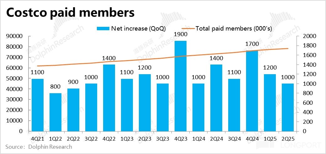 体量较小但利润率极高的会员费收入本季为 11.9 亿,同比增长 7.4%,增速较上季下滑了 0.4pct,低于市场预期的 9.5%,会员收入的表现不好。价量驱动上,本季度付费会员环比增加了 100 万人,同比增长 6.8%。无论是环比净增额或同比增长都是近期新低。