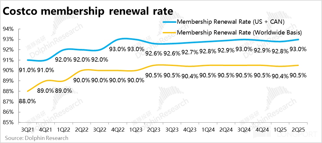 可能是 9 月份的提价和 Costco 近期加强对账户分享的打击,并加强了对会员身份的验证的影响。不过虽然新增走低,存量用户的续约率本季度继续提升。北美地区的续约率环比走高了 0.2pct 到 93%,全球续约率也上升了 0.1pct 到 90.5%。不过这也表明非北美地区的续约率是环比下降的。