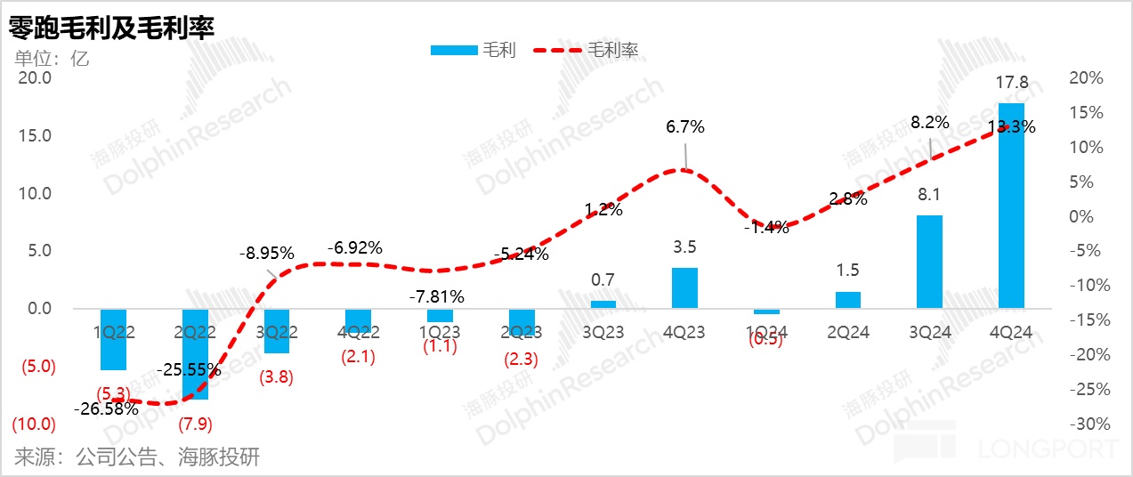 但需要注意一季度由于新车 B10 在 3 月才开始上市,4 月交付,所以零跑对 2024 款系列旧款车型开始降价促销,以及销量在 1-2 月国补还没在所有城市完全落地的情况下,预计一季度的毛利率可能会相比 Q4 有所回调。