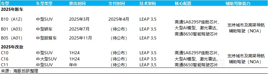 四季度公司同时在研发 LEAP 3.5 架构,在 2025 年 3 约首发,继续提升了整体的域控的集中度以及整车的性能与能力,首次搭载了高通 8650 智驾芯片(从原先的 Orin X 切换到高通芯片),配备了激光雷达等智驾硬件,1 个超级大脑可以支持端到端高阶智驾,统筹座舱、动力、车身域功能融合协同。