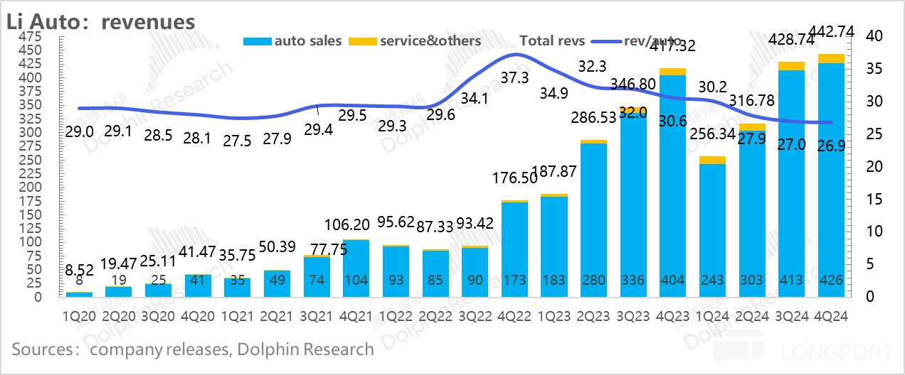 在销量已经公布的情况下,四季度理想总收入是 443 亿, 环比上行 3.3%,基本和市场预期一致,但低于部分大行的预期 440 亿元。