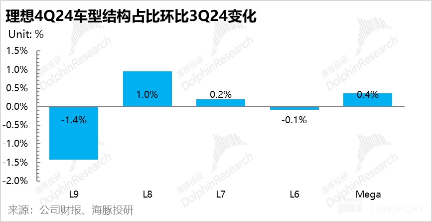 ① 1-2 月的销售结构其实是在略微向好的,高价车型 L9+Mega 的比例达到了 16.2%,相比 2024 年四季度上行了 1.5 个百分点,而低价车型 L6+L7 的比例是在下滑的(相比 2024Q4 下滑 1.7 个百分点左右);