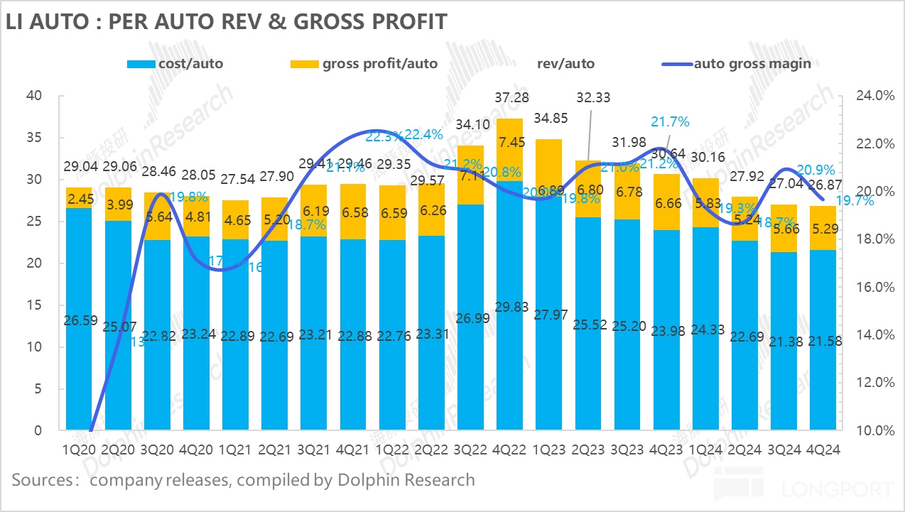 从 4Q24 业绩实际表现来看,在最关键的汽车毛利率上,理想此次 miss 掉了市场预期,本季度汽车业务毛利率仅 19.7%,环比下滑了 1.2 个百分点,而市场一致预期还在 20.6%,大行预期甚至都达到了 21.3%。