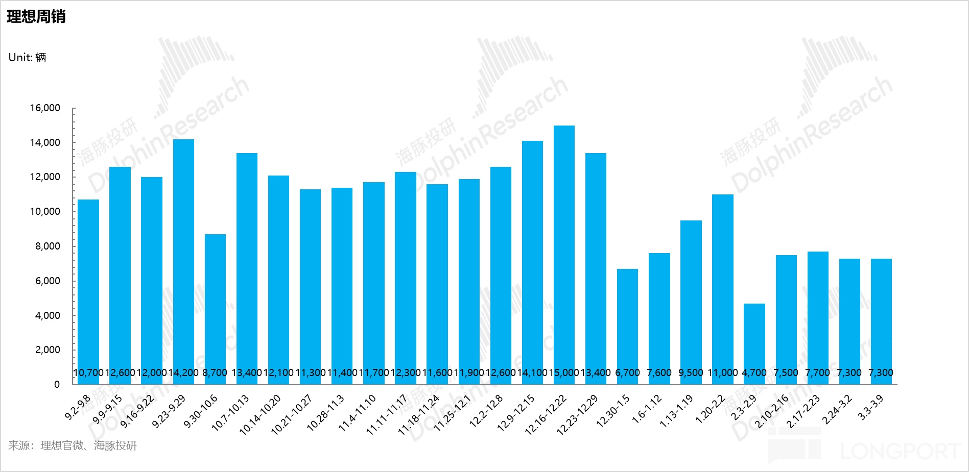 而目前理想最新一周的周销是 7300 辆(3/3-3/9),意味着在接下来的 3 周时间平均周销需要跑到 7600-9200 辆左右,在 3 月初已经开始对老款降价的情况下,虽然 3 月没新车,海豚君预计完成指引下限难度不大,但仍然要观测周销来看降价的作用有多大(能否完成指引上限)。