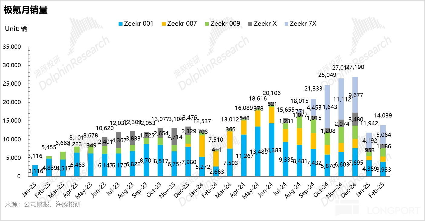 从目前的周销来看,极氪的表现相对一般,虽然一季度是销售淡季,但极氪在纯电市场的市占率仍然在下滑,从原来 3% 的纯电市占,已经下滑到 2025 年 1-2 月仅有 2.6% 左右。