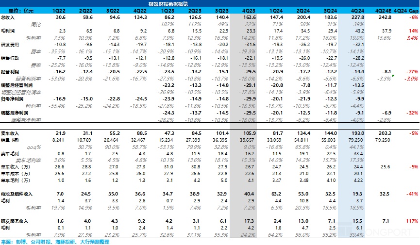 1)整体收入端低于市场预期:四季度收入 227.8 亿,低于市场预期 242.8 亿,预期差有接近 15 亿,但由于电池及组件业务环比上季度下滑了 13 亿(由于销售的电池包和电驱的销量减少和单价下滑),虽然研发及服务业务环比上行 8 亿(年底一系列研发项目验收,确认高峰期),所以这两项业务总收入最后环比下行 5 亿,但由于这两块业主要自供为主(供给吉利体系下公司),所以在没有看到外供起量前,市场也不会对这两块业务特别关注,所以核心仍然在汽车业务上。