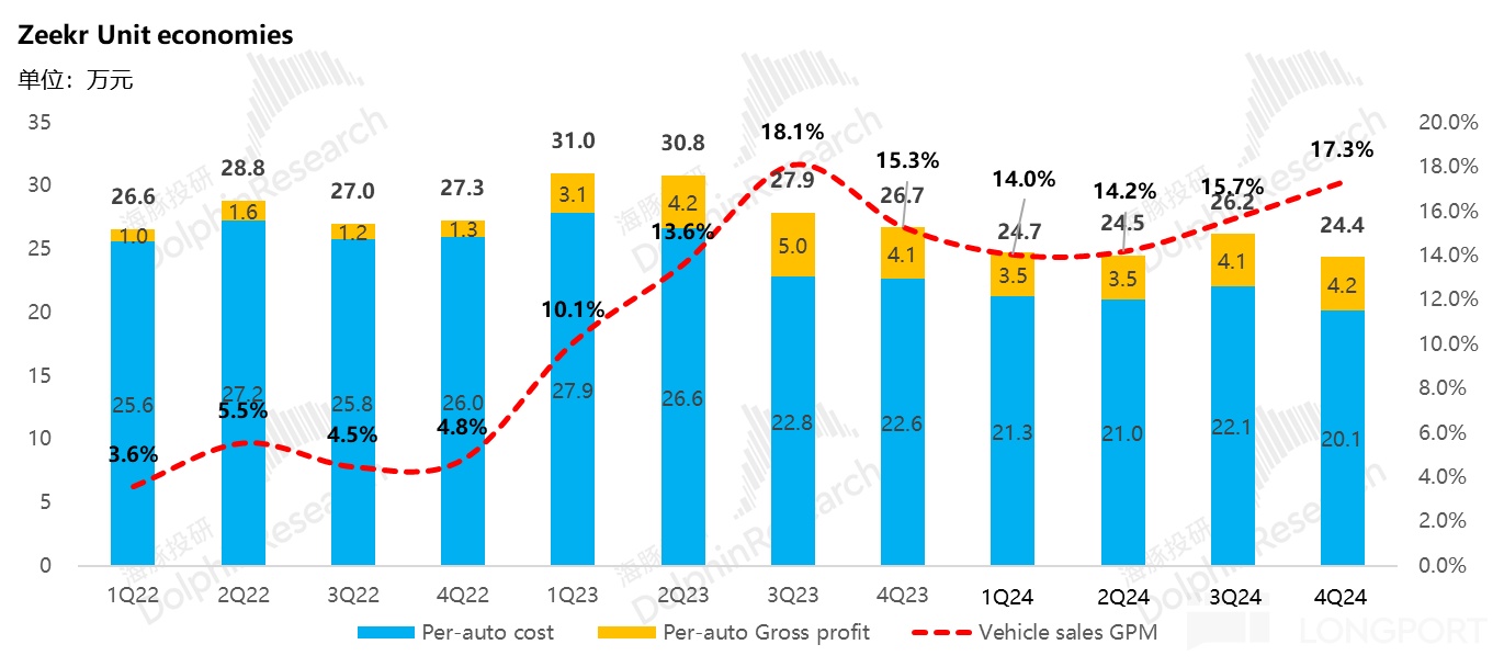 本季度单车成本 20 万元,环比下行了 2 万元,主要由于 9 月上市的极氪 7X 的爆销,带动了整体四季度销量环比继续回升 44% 至本季度 7.9 万辆,使单车摊折成本下滑,规模效应有所释放。