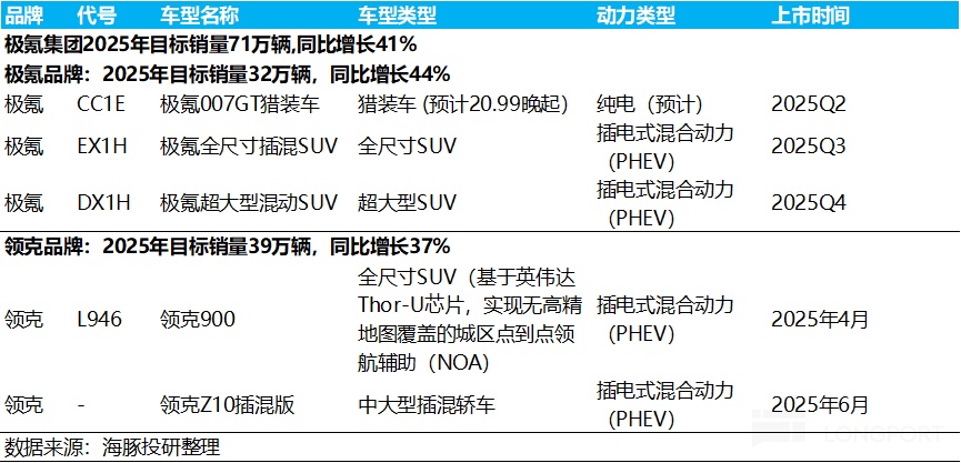 其中极氪品牌 2025 年全年销量目标 32 万辆,同比增长 44%,而今年极氪将会推出一款中型轿车和两款大型插混 SUV,领克品牌 2025 年目标销量 39 万辆,同比增长 37%,由两款插混新车支撑。