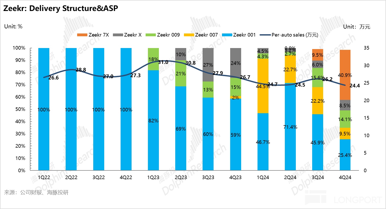 但新上市车型极氪 7X (纯电 SUV) 扛起了冲销量的重任,因为领先的三电优势,以及较强的性价比,在车型结构中占比环比提升了 31 个百分点至本季度 41%,带动了四季度整体销量环比回升 44% 至 22.2 万辆,虽然仍低于极氪之前所制定的 2024 年 23 万的销量预期。