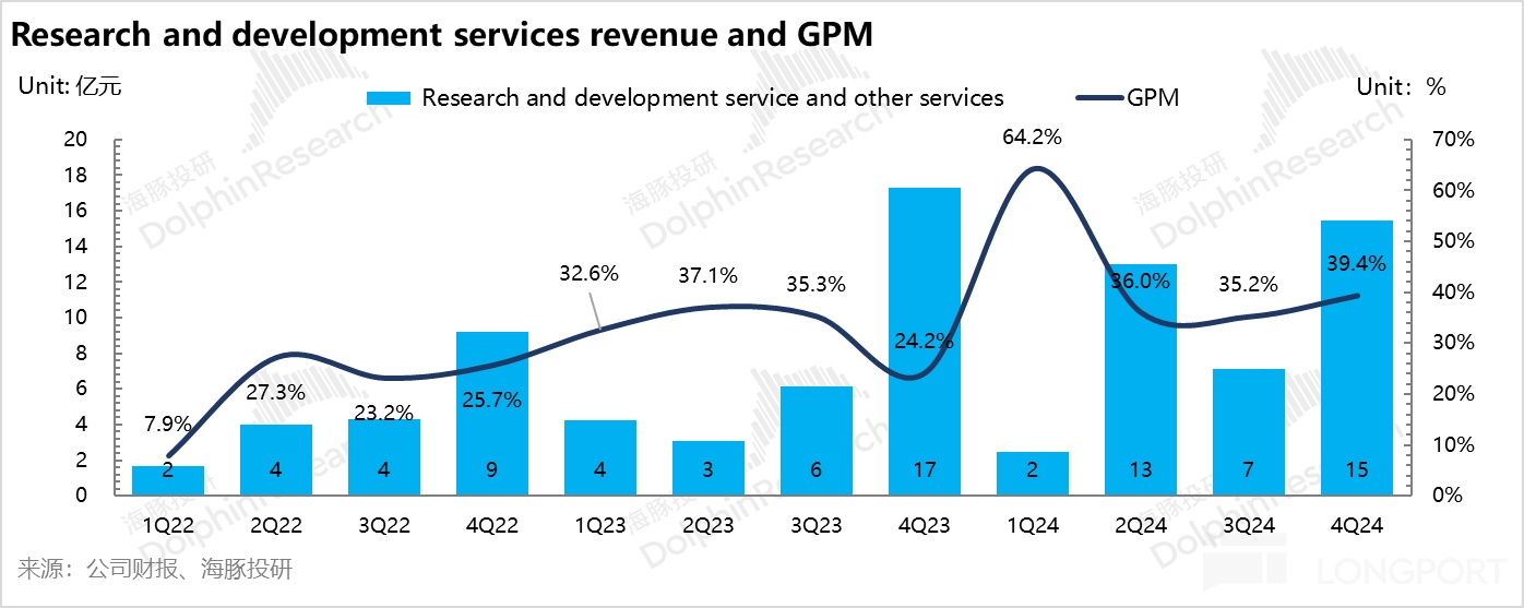 四季度研发服务收入 15.5 亿,相比上季度环比增加 8.3 亿,研发服务毛利率 39.4%,相比上季度环比增加 4.2 个百分点。
