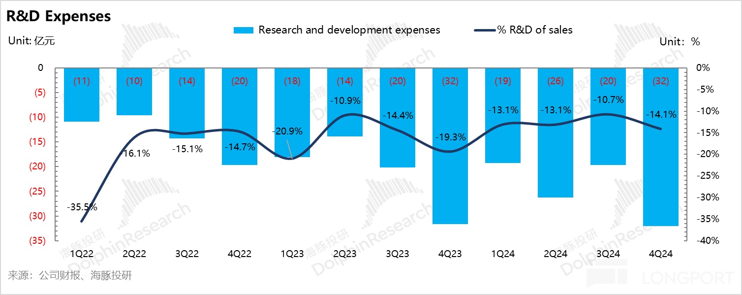 四季度极氪研发费用 32 亿,相比上季度环比增长 12 亿,研发投入也明显超出 2024 年 80 亿的指引,海豚君认为仍然极氪仍然在补智驾短板,以及投入 2025 款新车型的研发。