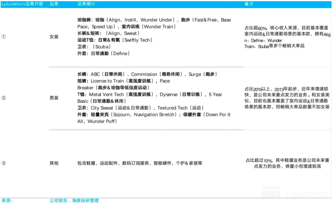 根据公司的披露口径,Lululemon 的营收主要来源于女装、男装、其他三个业务,我们先简单介绍一下这三项业务以便后文展开深入分析。